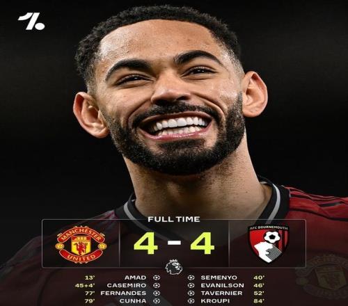 全场战罢,曼联主场4-4上演进球大战收获平局,近5次对阵伯恩茅斯3平2负难求一胜,B费传射当选MVP。 假如门前站着的是奥纳纳,这场比赛很可能是变成曼联领先过3次,但最后被对手绝杀的尴尬剧情……